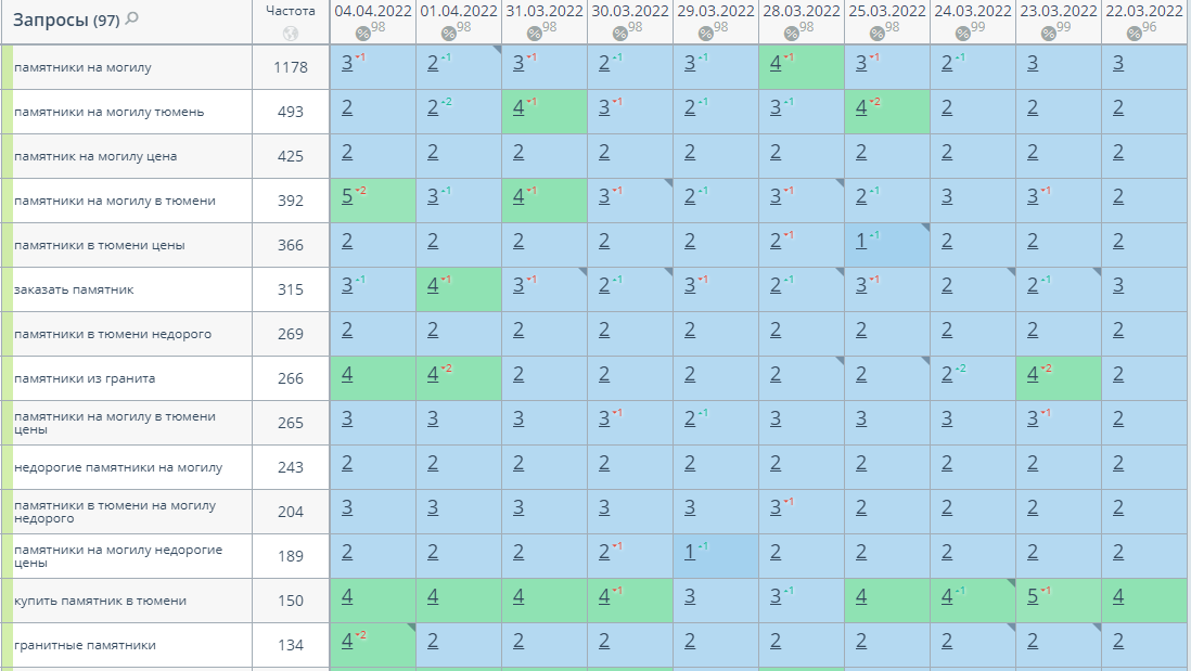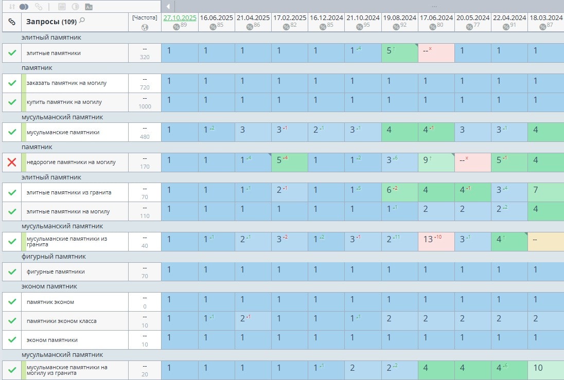 Сбор высокочастотных и среднечастотных запросов по теме оказания услуг по изготовлению памятников, оптимизация страниц сайта под запросы для их выведения в ТОП-10 выдачи поисковых систем:
