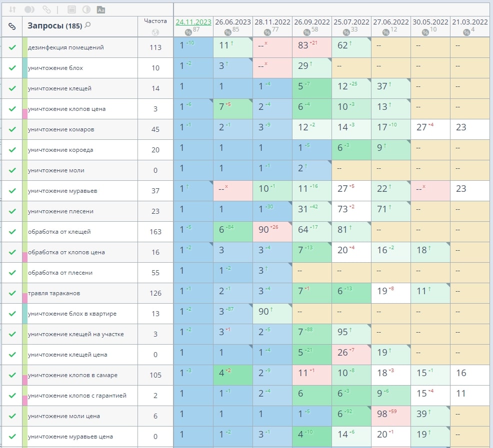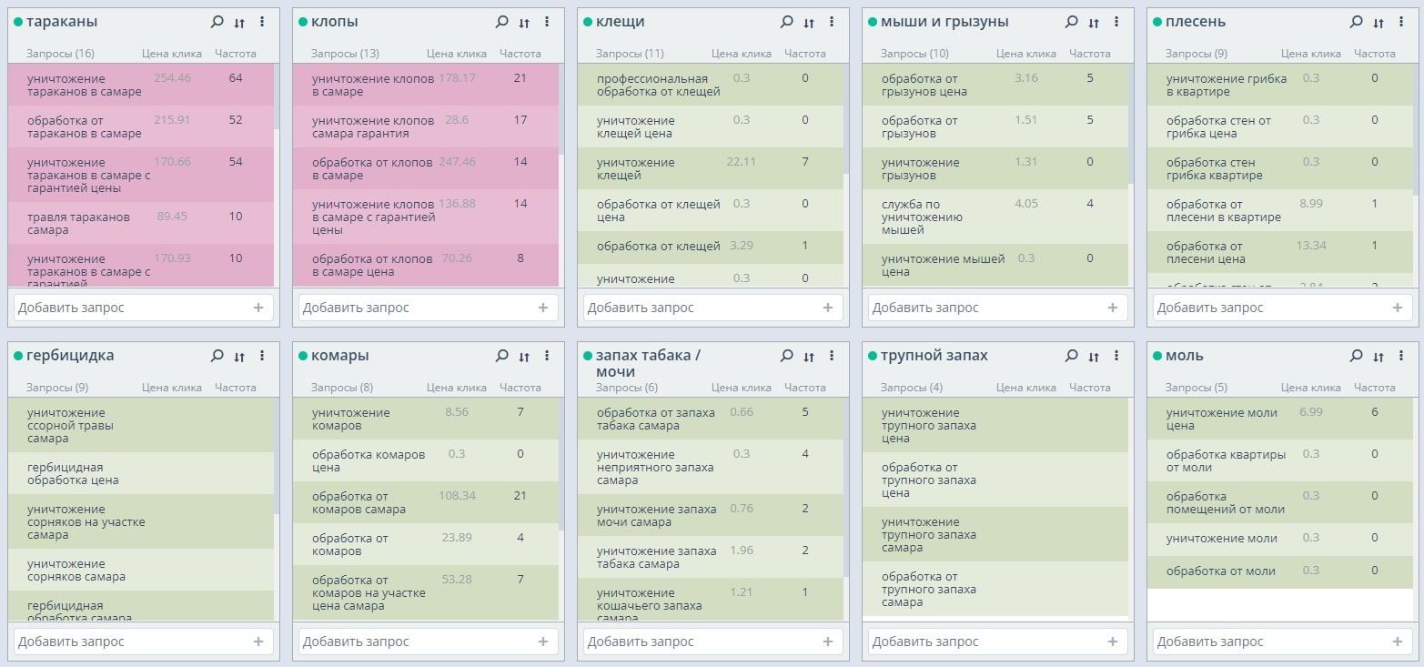 1. Сбор высокочастотных и среднечастотных запросов по теме услуг санитарной службы и последующая их фильтрация по коммерческим и информационным поисковым запросам.